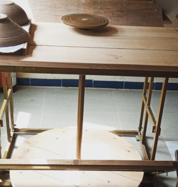 En Huella de Barro trabajamos con técnicas artesanales y herramientas que guardan historia. Nuestro torno alfarero es el corazón del proceso: con él, damos forma a cada pieza, una a una, siguiendo el ritmo de las manos y del barro.Funciona con una rueda, sin motores ni prisas. Forma parte viva del taller, creando una unión entre arcilla, cuerpo y movimiento. Su uso requiere paciencia y técnica, pero ofrece una experiencia física y meditativa. Cada giro es una conversación con la materia, cada pieza que nace lleva consigo el ritmo lento y auténtico de la cerámica de antes.